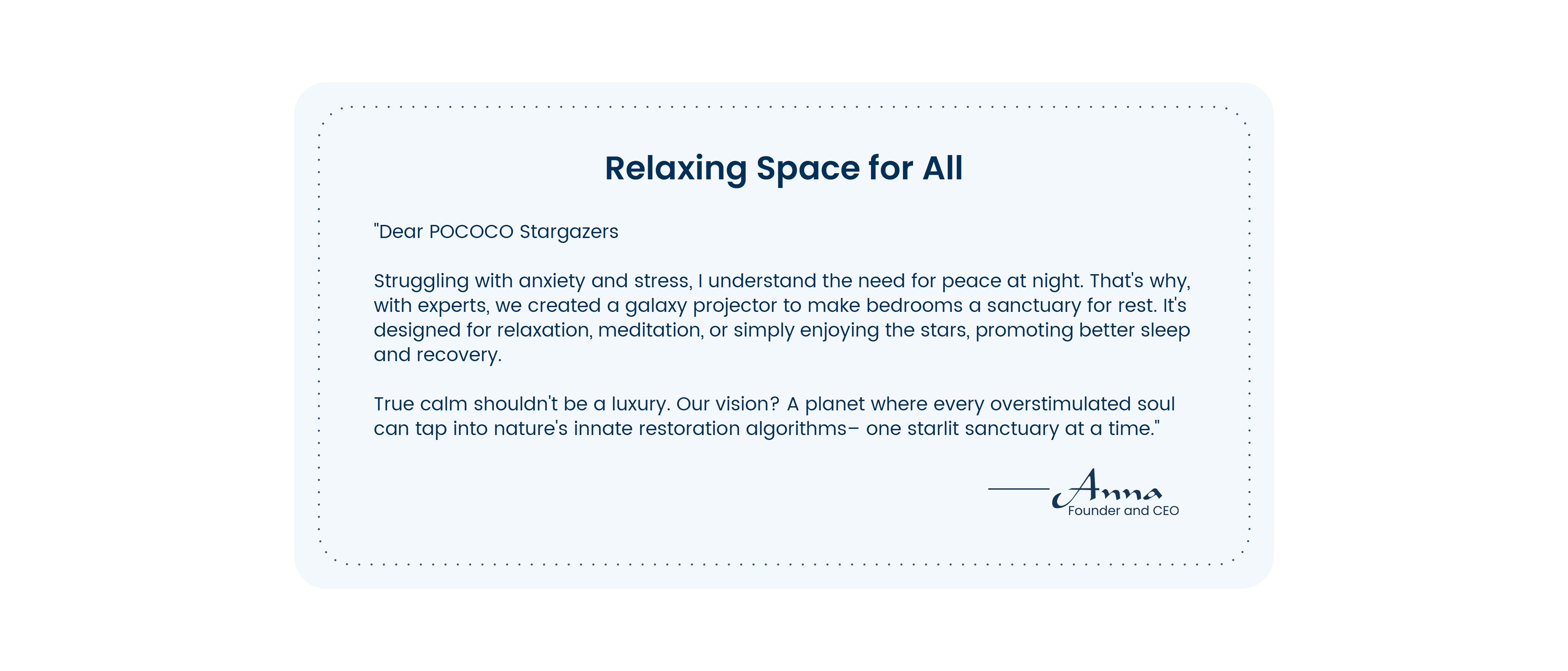 "Research shows that experiencing captivating visuals, like a starry sky, can restore brain focus, ease mental fatigue, reduce anxiety, and find inner peace, all vital for mental restoration. When we create space for sustained serenity, it fundamentally transforms how we engage with the world, making us more present, creative, and attuned to life's possibilities.